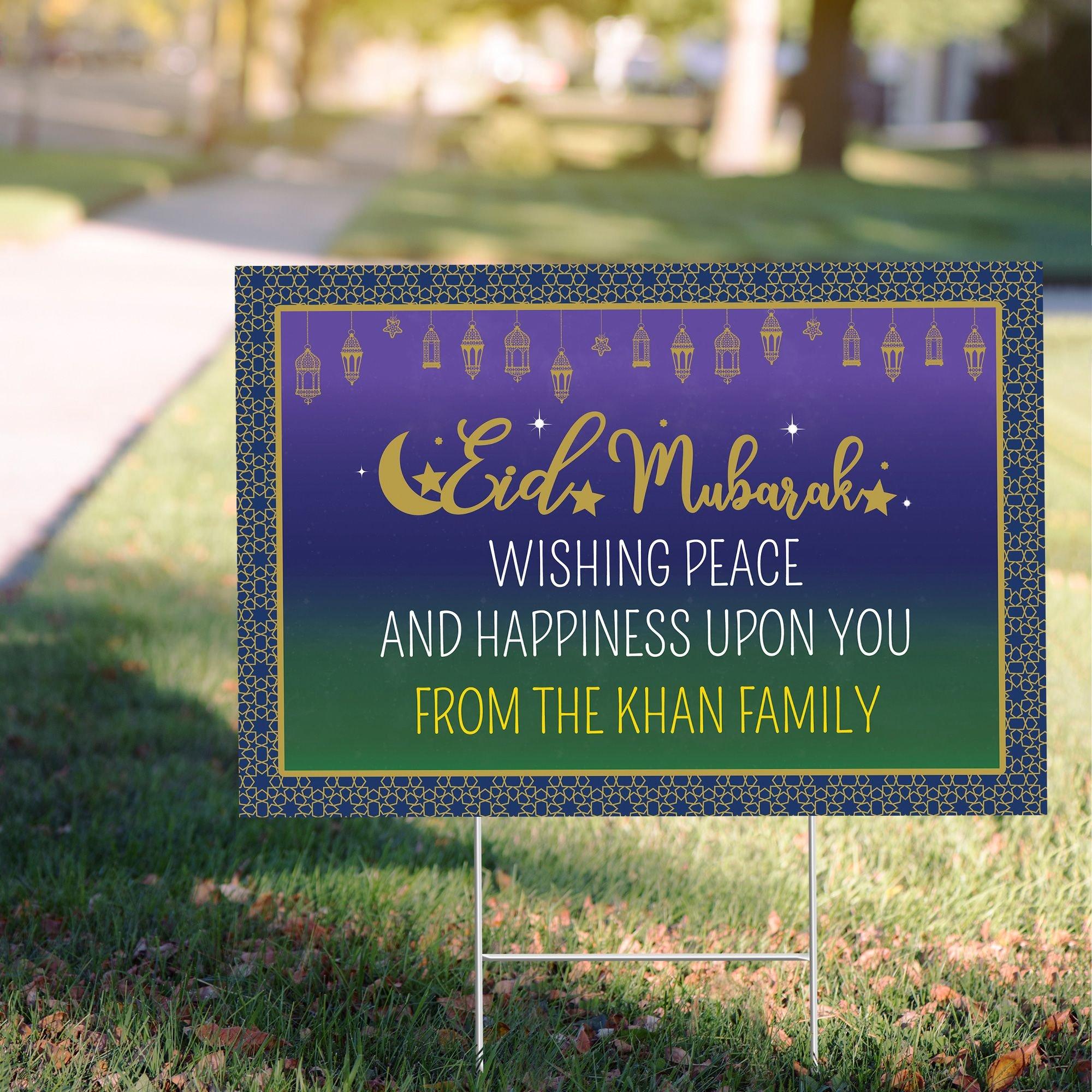 Celebrate Eid al-Adha in style with Party City's Custom Eid Mubarak Yard Sign, a 22in x 15in plastic decoration that adds a festive touch to your outdoor space. This durable, weather-resistant sign features vibrant colors and personalized details to welcome guests and warmly showcase Eid's joyous spirit. It’s the perfect way to honor the occasion and share your festive cheer with the neighborhood.